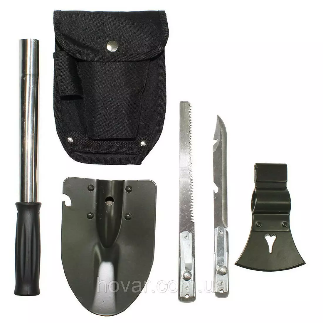 У комплекті 5 інструментів, які розміщуються на універсальній ручці та складаються у сумку з петлею для ременя.