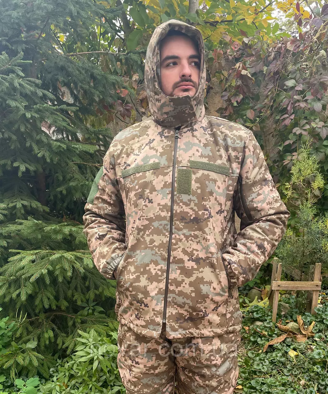 Бушлат-куртка пряма і подовжена, застібається на блискавку. Пошита із зносостійкого, водо- та вітровідштовхувального матеріалу SOFT SHELL. Високий комір-стійка на застібці Velcro (липучка). Рукава з манжетами на резинці. Зручний капюшон, не знімається. 4 кишені (1 внутрішня, 2 з боків нижче талії, 1 на рукаві). Є липучки для шевронів та інших знаків.