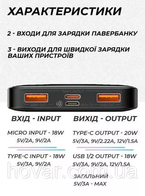 - Має 4 роз'єми: 2 USB, Micro-USB та USB Type C, що дозволяє заряджати 3 пристрої одночасно.