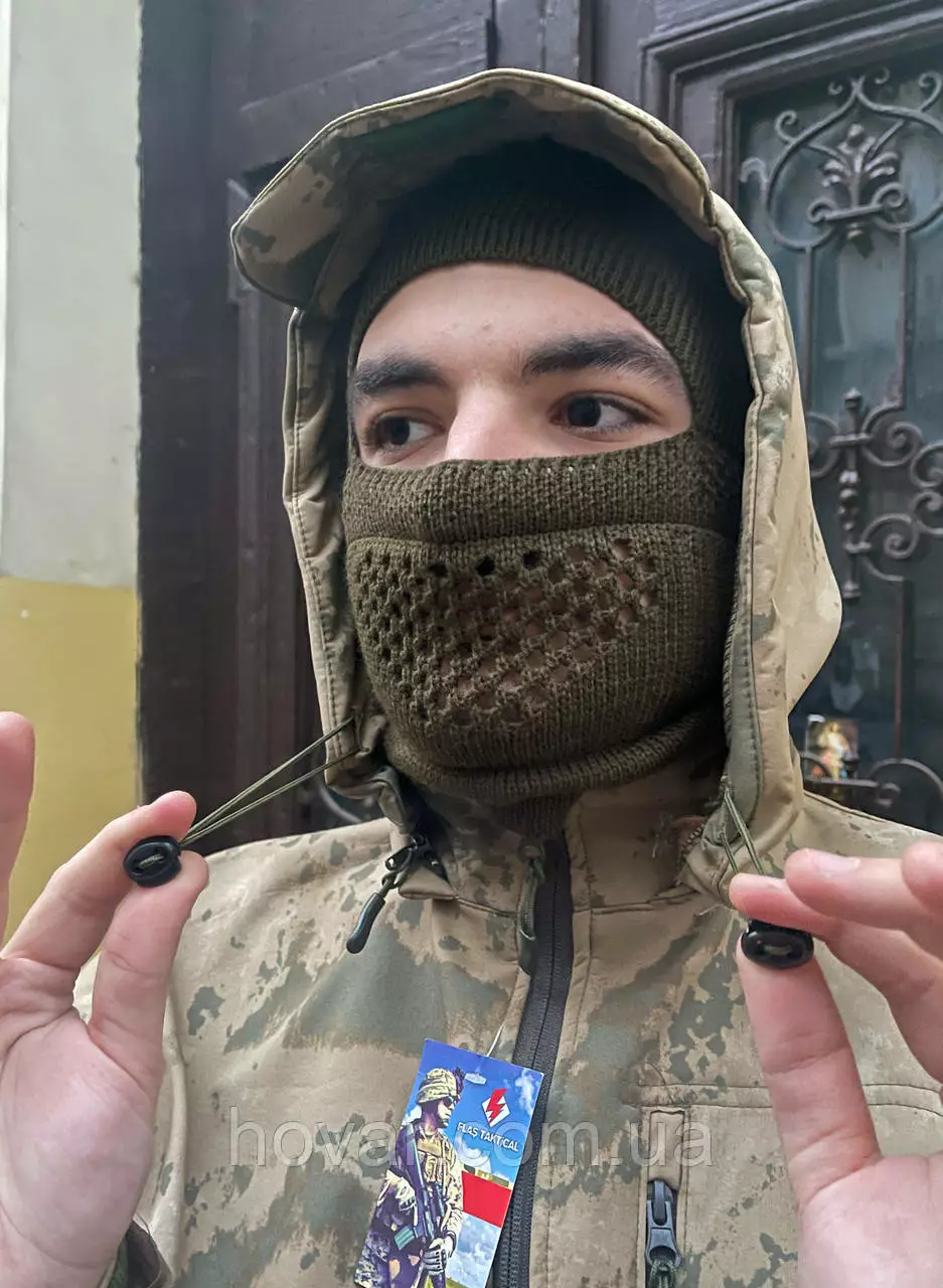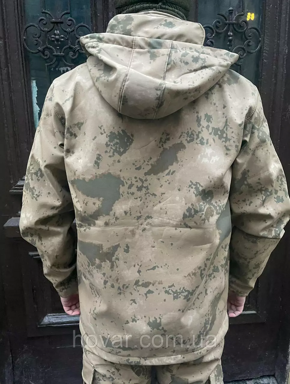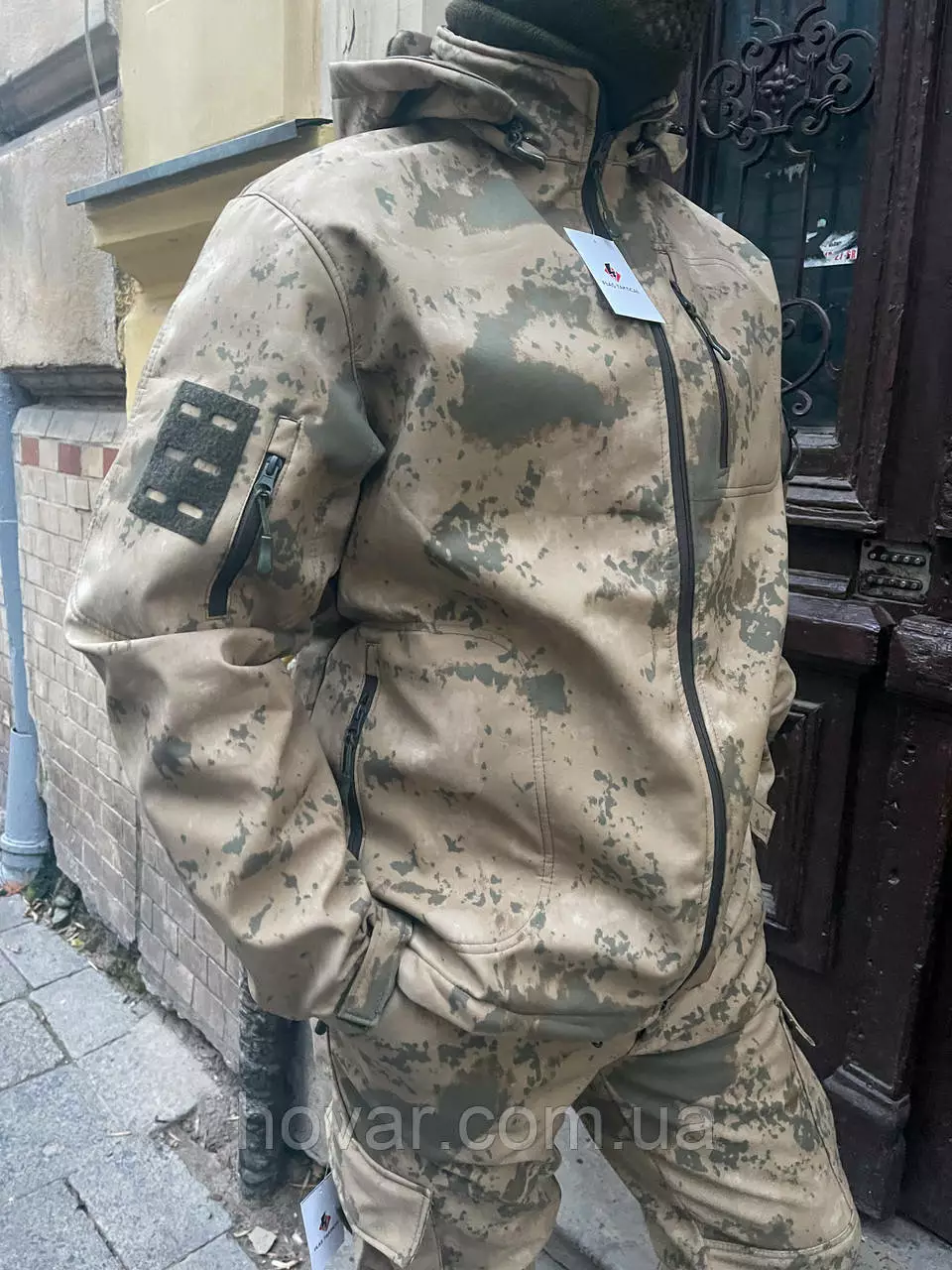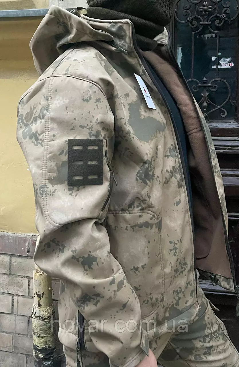 Військова куртка виготовлена із міцної водостійкої тканини SoftShell. Забезпечує хорошу терморегуляцію та захист від вітру і холоду за допомогою флісової підкладки.