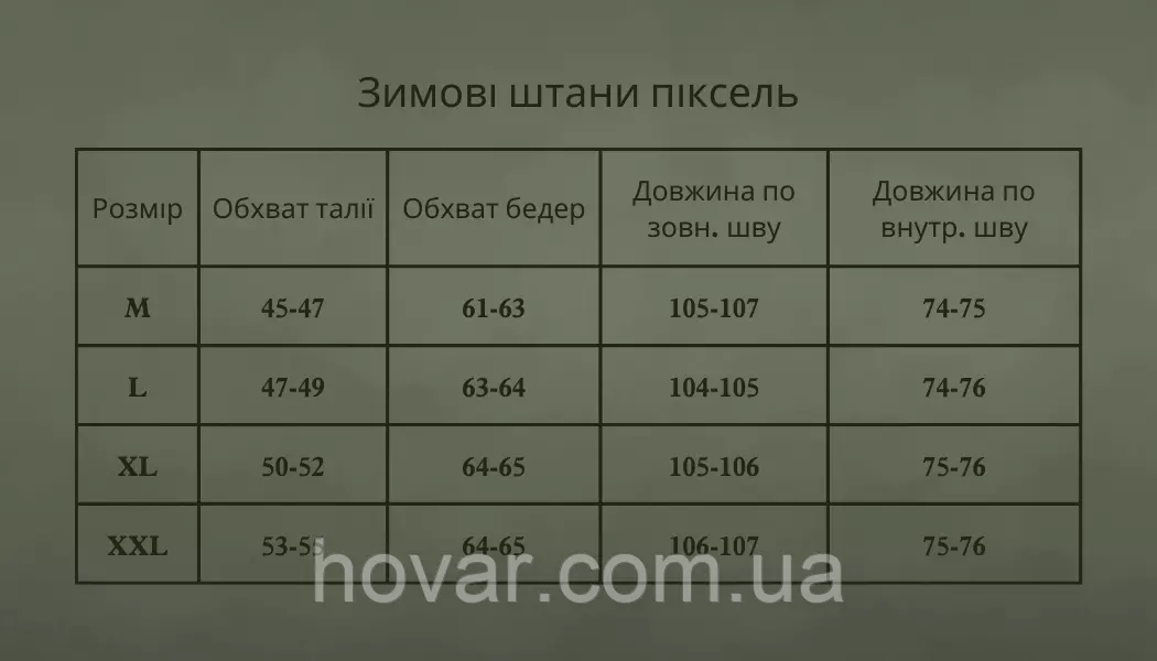 Штани високого крою, завдяки чому поясниця знаходиться в теплі, манжети на резинках з затяжками. Розстібаються блискавкою знизу аж до стегон для швидкого доступу до ноги у разі поранення.