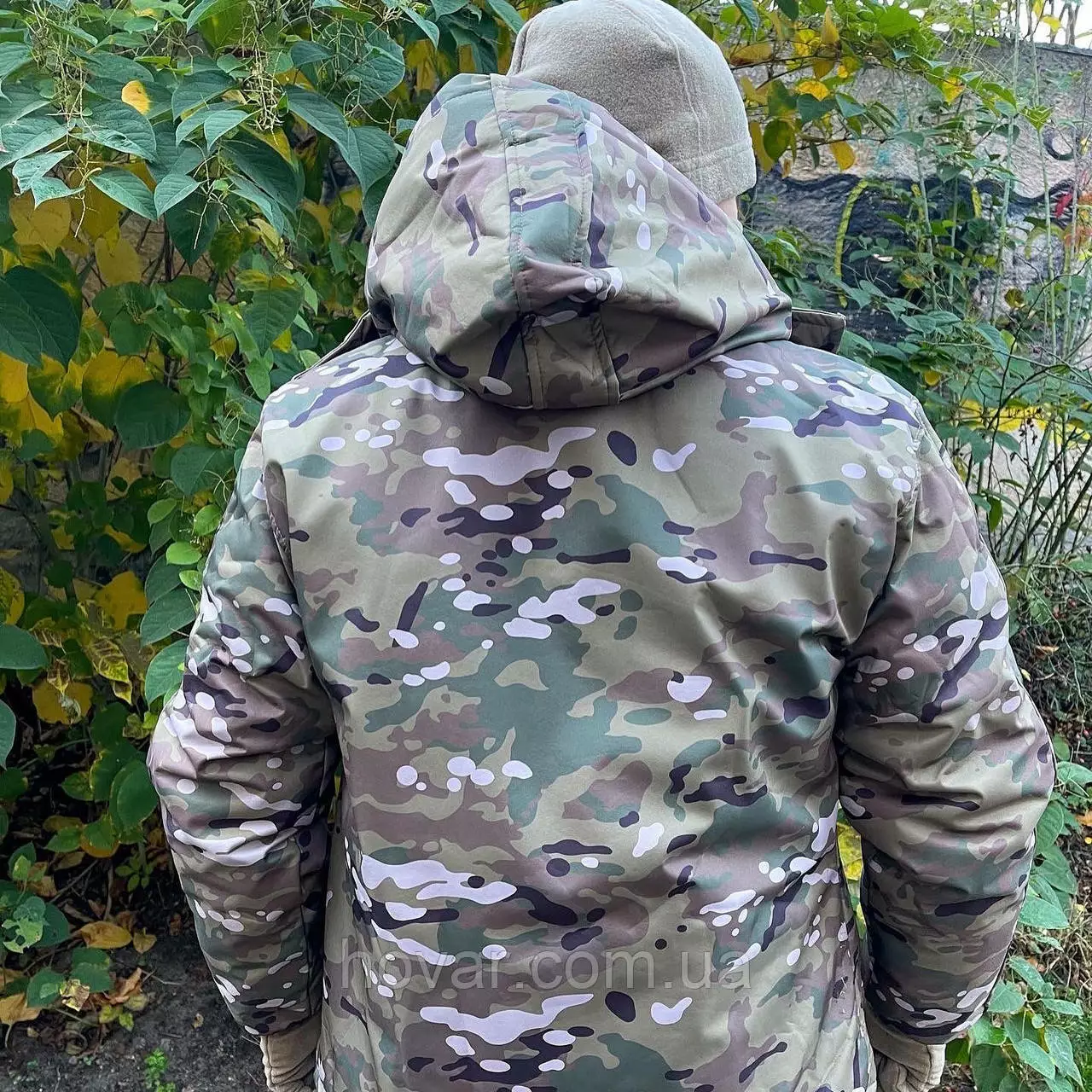 Бушлат-куртка пряма і подовжена, застібається на блискавку. Пошита із зносостійкого, водо- та вітровідштовхувального матеріалу SOFT SHELL. Високий комір-стійка на застібці Velcro (липучка). Рукава з манжетами на резинці. Зручний капюшон, не знімається. 4 кишені (1 внутрішня, 2 з боків нижче талії, 1 на рукаві). Є липучки для шевронів та інших знаків.
